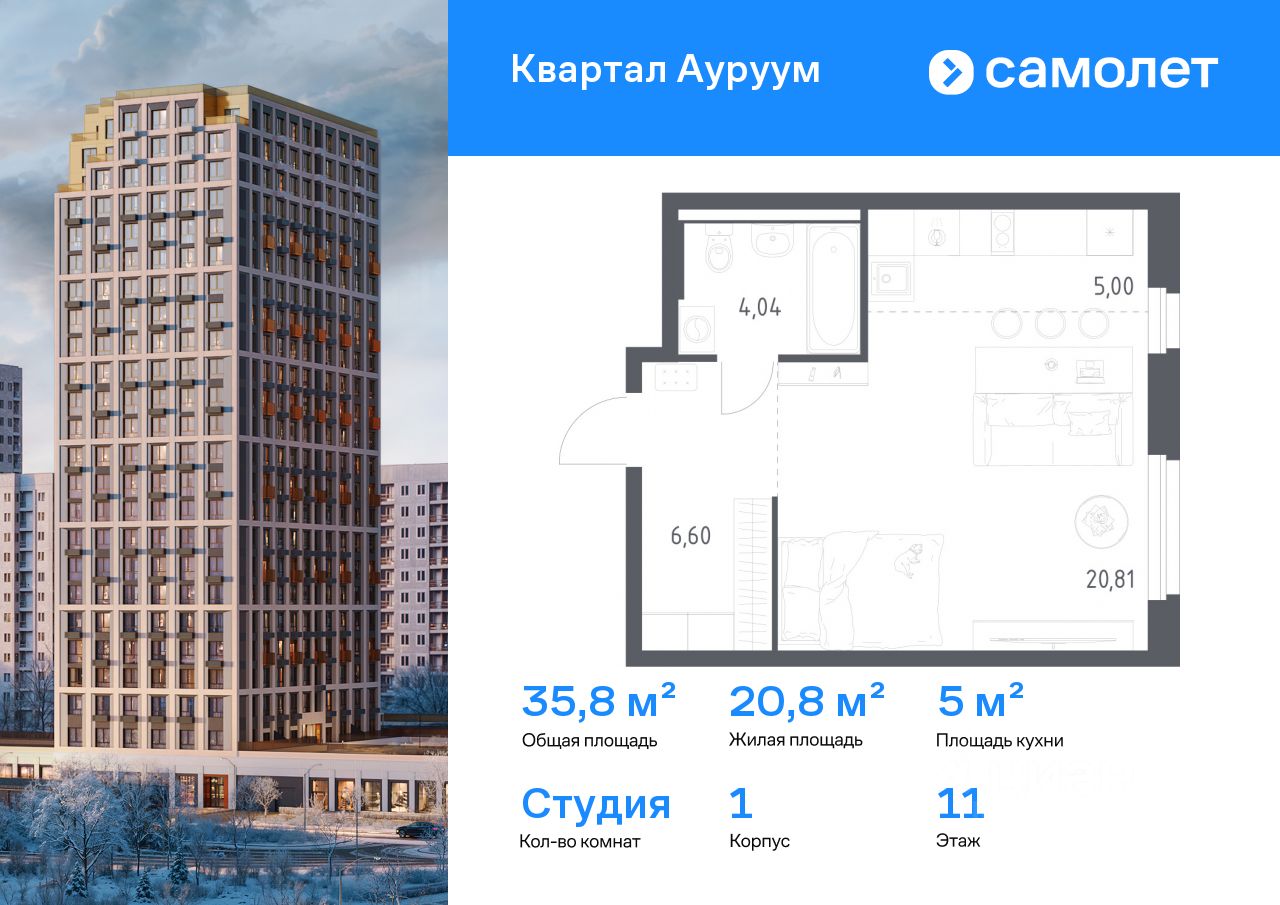 Строим кварталы для жизни с заботой о будущем. Предлагается квартира студия бизнес-класса 35,8 кв.м в корпусе 1 на 11 этаже, в ЖК "Квартал Ауруум"