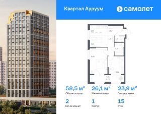 Строим кварталы для жизни с заботой о будущем. Предлагается 2-комнатная квартира бизнес-класса 58,5 кв.м в корпусе 1 на 15 этаже, в ЖК "Квартал Ауруум"