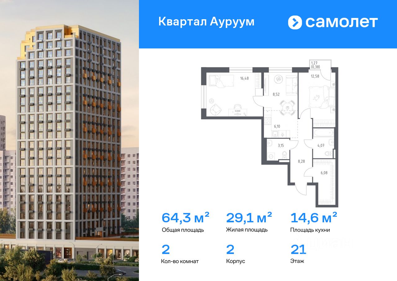 Строим кварталы для жизни с заботой о будущем. Предлагается 2-комнатная квартира бизнес-класса 64,3 кв.м в корпусе 2 на 21 этаже, в ЖК "Квартал Ауруум"