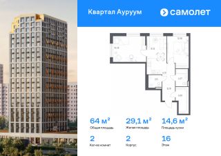 Строим кварталы для жизни с заботой о будущем. Предлагается 2-комнатная квартира бизнес-класса 64 кв.м в корпусе 2 на 16 этаже, в ЖК "Квартал Ауруум"