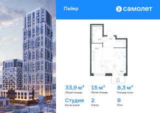 Строим кварталы для жизни с заботой о будущем. Предлагается квартира студия комфорт-класса 33,88 кв.м в корпусе 2 на 8 этаже, в ЖК "Пайер"