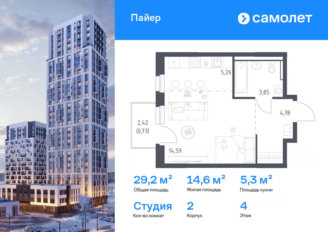 Строим кварталы для жизни с заботой о будущем. Предлагается квартира студия комфорт-класса 29,21 кв.м в корпусе 2 на 4 этаже, в ЖК "Пайер"