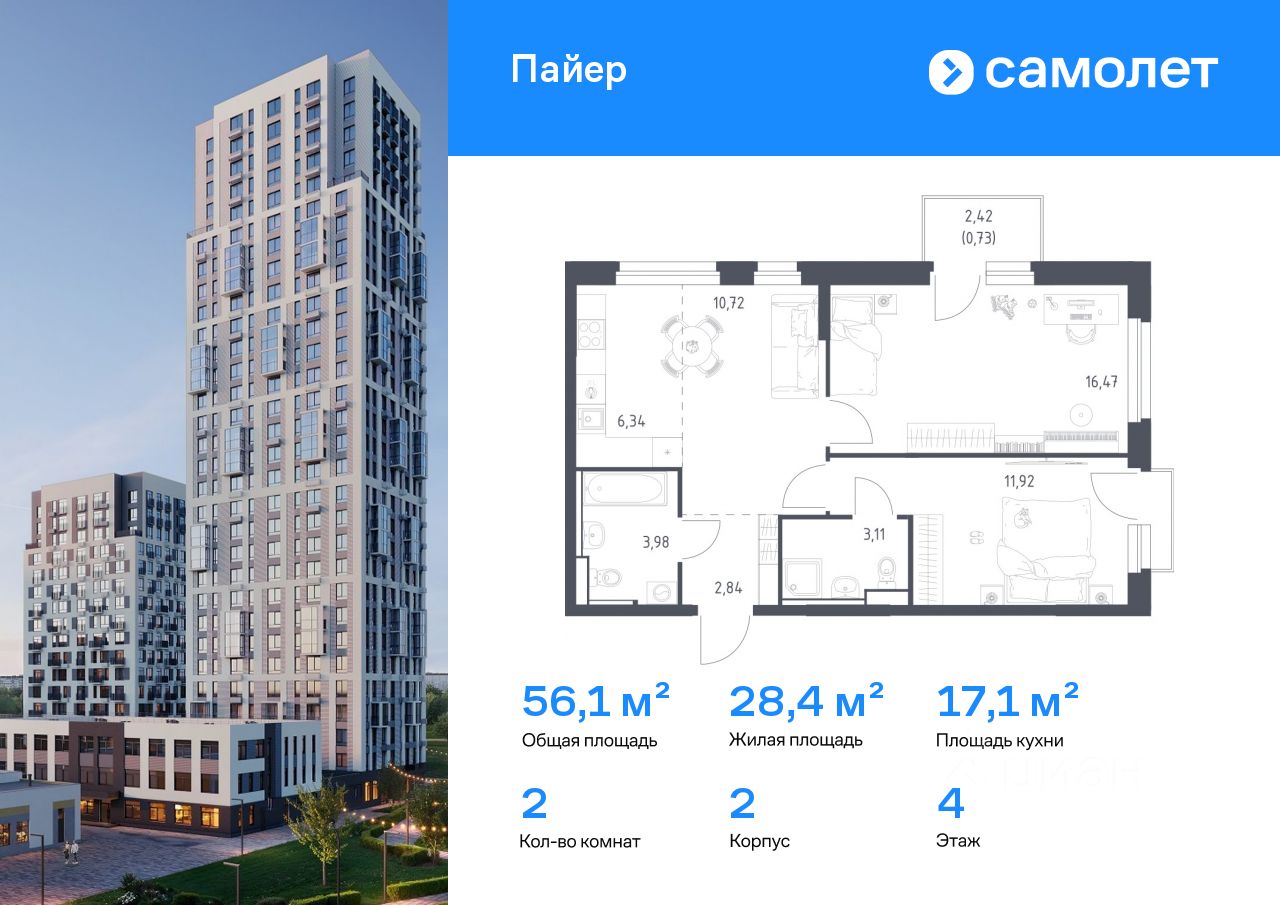 Строим кварталы для жизни с заботой о будущем. Предлагается 2-комнатная квартира комфорт-класса 56,11 кв.м в корпусе 2 на 4 этаже, в ЖК "Пайер"