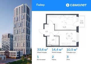 Строим кварталы для жизни с заботой о будущем. Предлагается 1-комнатная квартира комфорт-класса 33,55 кв.м в корпусе 2 на 3 этаже, в ЖК "Пайер"