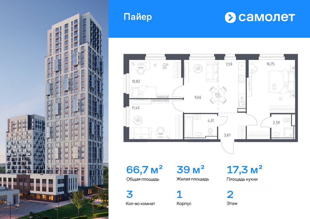 Строим кварталы для жизни с заботой о будущем. Предлагается 3-комнатная квартира комфорт-класса 66,74 кв.м в корпусе 1 на 2 этаже, в ЖК "Пайер"