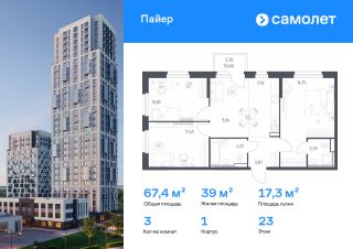 Строим кварталы для жизни с заботой о будущем. Предлагается 3-комнатная квартира комфорт-класса 67,4 кв.м в корпусе 1 на 23 этаже, в ЖК "Пайер"