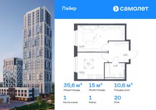 Строим кварталы для жизни с заботой о будущем. Предлагается 1-комнатная квартира комфорт-класса 35,6 кв.м в корпусе 1 на 20 этаже, в ЖК "Пайер"