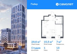 Строим кварталы для жизни с заботой о будущем. Предлагается квартира студия комфорт-класса 29,58 кв.м в корпусе 1 на 13 этаже, в ЖК "Пайер"