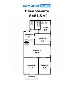 Квартира с удобной планировкой, отлично подходит для комфортного проживания большой и дружной семьи. Общая площадь составляет 61,5 м²