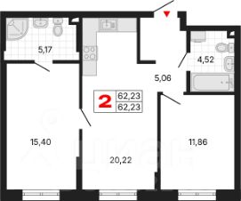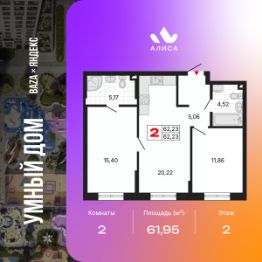 Продается 2-комн. квартира с предчистовой отделкой в ЖК "Алиса" на 2 этаже. Общая площадь: 61.95 кв.м., жилая: 27.26 кв.м., площадь просторной кухни-столовой: 20.22 кв.м. Комнаты изолированные, все окна выходят на одну сторону. В квартире два совмещенных санузла. Высота потолков 2.72 м.
