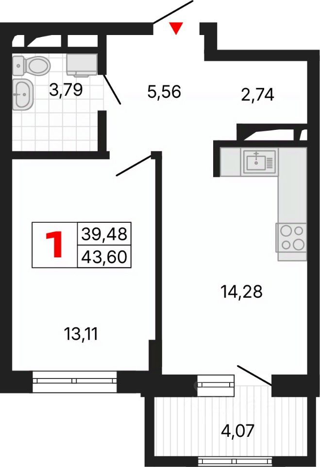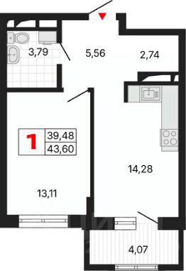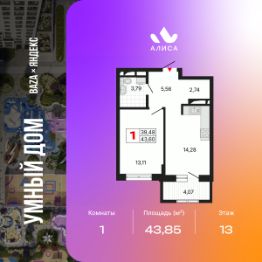 Продается 1-комн. квартира от застройщика с предчистовой отделкой в ЖК "Алиса" на 13 этаже. Общая площадь: 43.85 кв.м., жилая: 13.11 кв.м., площадь просторной кухни-столовой: 14.28 кв.м. Все окна выходят на одну сторону. В квартире один балкон, один совмещенный санузел. Высота потолков 2.72 м.