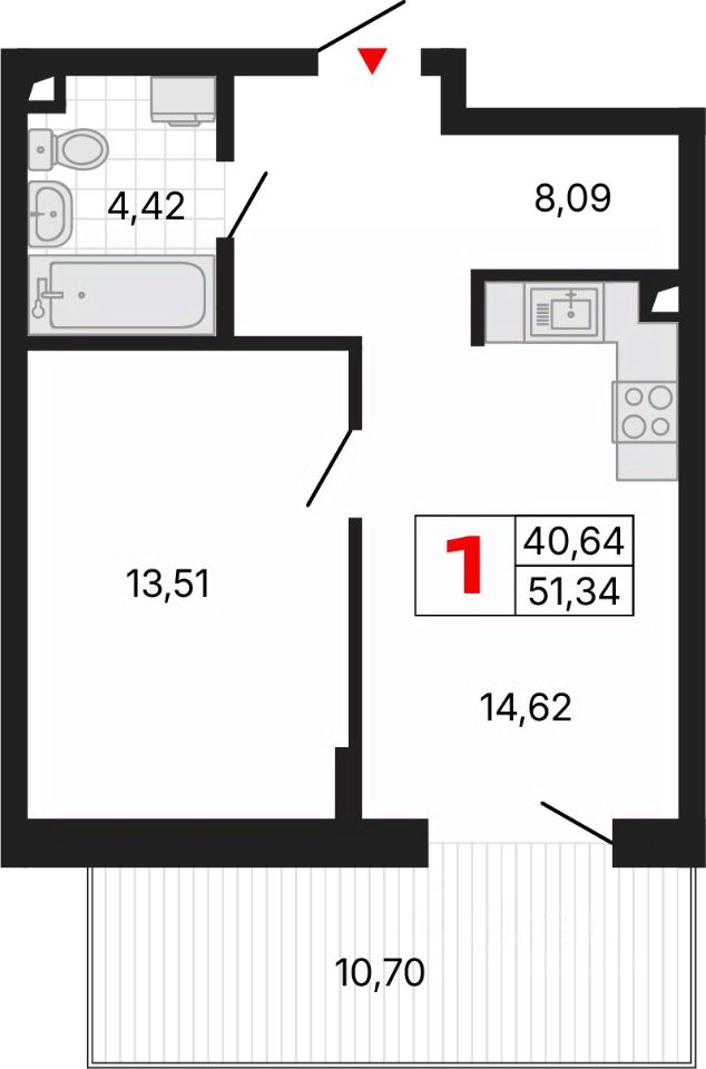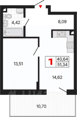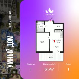 Просторная однокомнатная квартира с предчистовой отделкой в ЖК "Алиса" на 1 этаже. Общая площадь: 51.47 кв.м., жилая: 13.51 кв.м., площадь просторной кухни-столовой: 14.62 кв.м. Все окна выходят на одну сторону. В квартире один балкон, один совмещенный санузел. Терраса представляет собой роскошную зону отдыха для проведение вечеров в кругу семьи и друзей или организация вечеринок. Высота потолков 2.72 м.