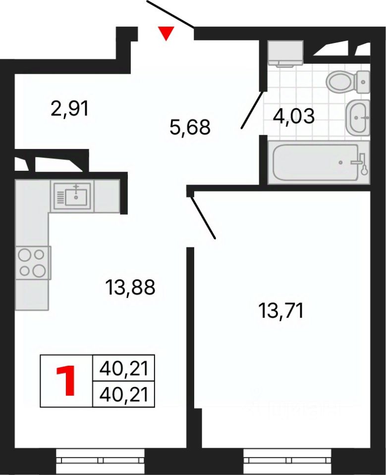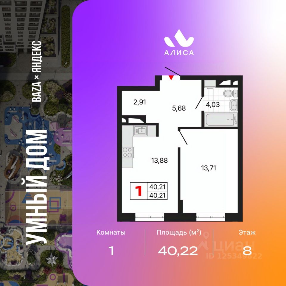 Однокомнатная квартира с предчистовой отделкой в ЖК "Алиса" на 8 этаже. Общая площадь: 40.22 кв.м., жилая: 13.71 кв.м., площадь просторной кухни-столовой: 13.88 кв.м. Все окна выходят на одну сторону. В квартире один совмещенный санузел. Высота потолков 2.72 м.