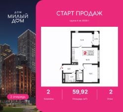 Продается 2-комн. квартира с предчистовой отделкой в ЖК "Милый дом" на 2 этаже. Общая площадь: 59.92 кв.м., жилая: 25.1 кв.м., площадь просторной кухни-столовой: 18.7 кв.м. Квартира угловая, очень светлая, естественная вентиляция при открытии окон. В квартире одна лоджия, один совмещенный и один раздельный санузел. Высота потолков 2.7 м.