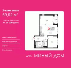Двухкомнатная квартира с предчистовой отделкой в ЖК "Милый дом" на 8 этаже. Общая площадь: 59.92 кв.м., жилая: 25.1 кв.м., площадь просторной кухни-столовой: 18.7 кв.м. Квартира угловая, очень светлая, естественная вентиляция при открытии окон. В квартире одна лоджия, один совмещенный и один раздельный санузел. Высота потолков 2.7 м.