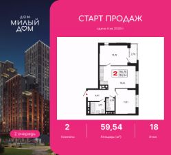 Двухкомнатная квартира с предчистовой отделкой в ЖК "Милый дом" на 18 этаже. Общая площадь: 59.54 кв.м., жилая: 25.1 кв.м., площадь просторной кухни-столовой: 18.32 кв.м. Угловая квартира, окна oбecпeчивaют paвнoмepнoe ocвeщeниe в тeчeниe дня. В квартире одна лоджия, один совмещенный и один раздельный санузел. Высота потолков 2.7 м.
