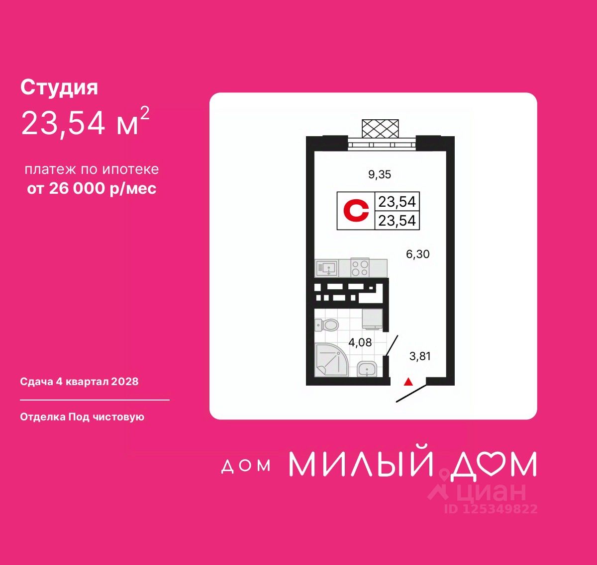 1-комн. квартира-студия с предчистовой отделкой в ЖК "Милый дом" на 28 этаже. Общая площадь: 23.54 кв.м., площадь гостиной 9.35 кв.м., из которых 5 кв.м. выделено под кухонную зону. Все окна выходят на одну сторону. В квартире один совмещенный санузел. Высота потолков 2.7 м.
