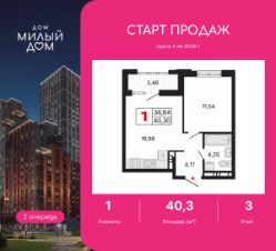 1-комн. квартира от застройщика с предчистовой отделкой в ЖК "Милый дом" на 3 этаже. Общая площадь: 40.3 кв.м., жилая: 11.54 кв.м., площадь просторной кухни-столовой: 16.88 кв.м. Все окна выходят на одну сторону. В квартире одна лоджия, один совмещенный санузел. Высота потолков 2.7 м.