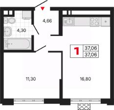 1-комн. квартира с предчистовой отделкой в ЖК "Милый дом" на 2 этаже. Общая площадь: 37.06 кв.м., жилая: 11.3 кв.м., площадь просторной кухни-столовой: 16.8 кв.м. Все окна выходят на одну сторону. В квартире один совмещенный санузел. Высота потолков 2.7 м.