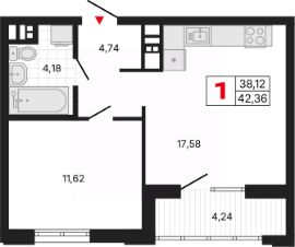 Продается 1-комн. квартира с предчистовой отделкой в ЖК "Милый дом" на 4 этаже. Общая площадь: 42.36 кв.м., жилая: 11.62 кв.м., площадь просторной кухни-столовой: 17.58 кв.м. Все окна выходят на одну сторону. В квартире одна лоджия, один совмещенный санузел. Высота потолков 2.7 м.