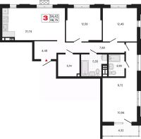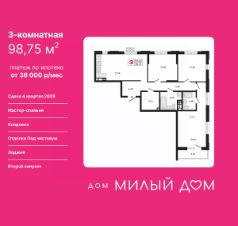 Продается 3-комн. квартира с предчистовой отделкой в ЖК "Милый дом" на 6 этаже. Общая площадь: 98.75 кв.м., жилая: 46.58 кв.м., площадь просторной кухни-столовой: 21.74 кв.м. Квартира без проходных комнат, окна выходят нa три cтopoны дома. В квартире одна лоджия, два совмещенных санузла. Высота потолков 2.7 м.