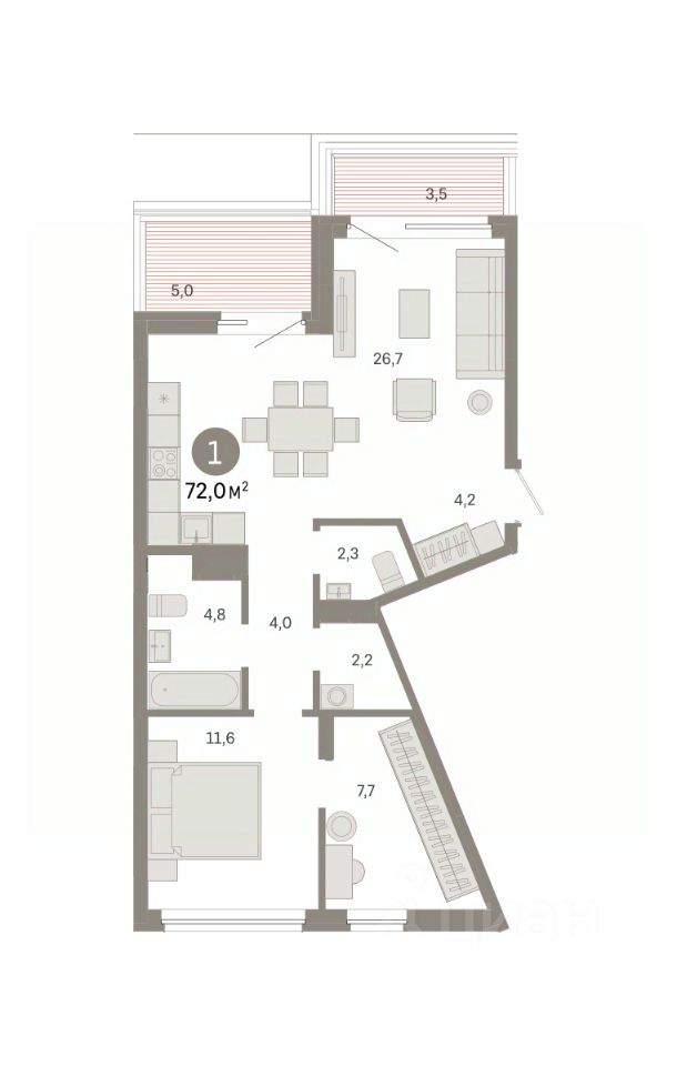 Квартира с кухней-гостиной и одной спальней в районе Шишимская горка. Особенности планировки: второй санузел, вид во двор, предчистовая отделка, терраса, постирочная, терраса на крыше.
