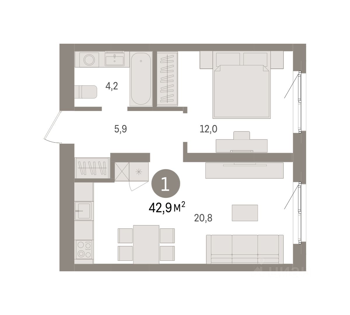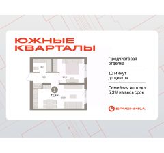 Квартира с кухней-гостиной и одной спальней в Южных кварталах. Особенности планировки: предчистовая отделка.