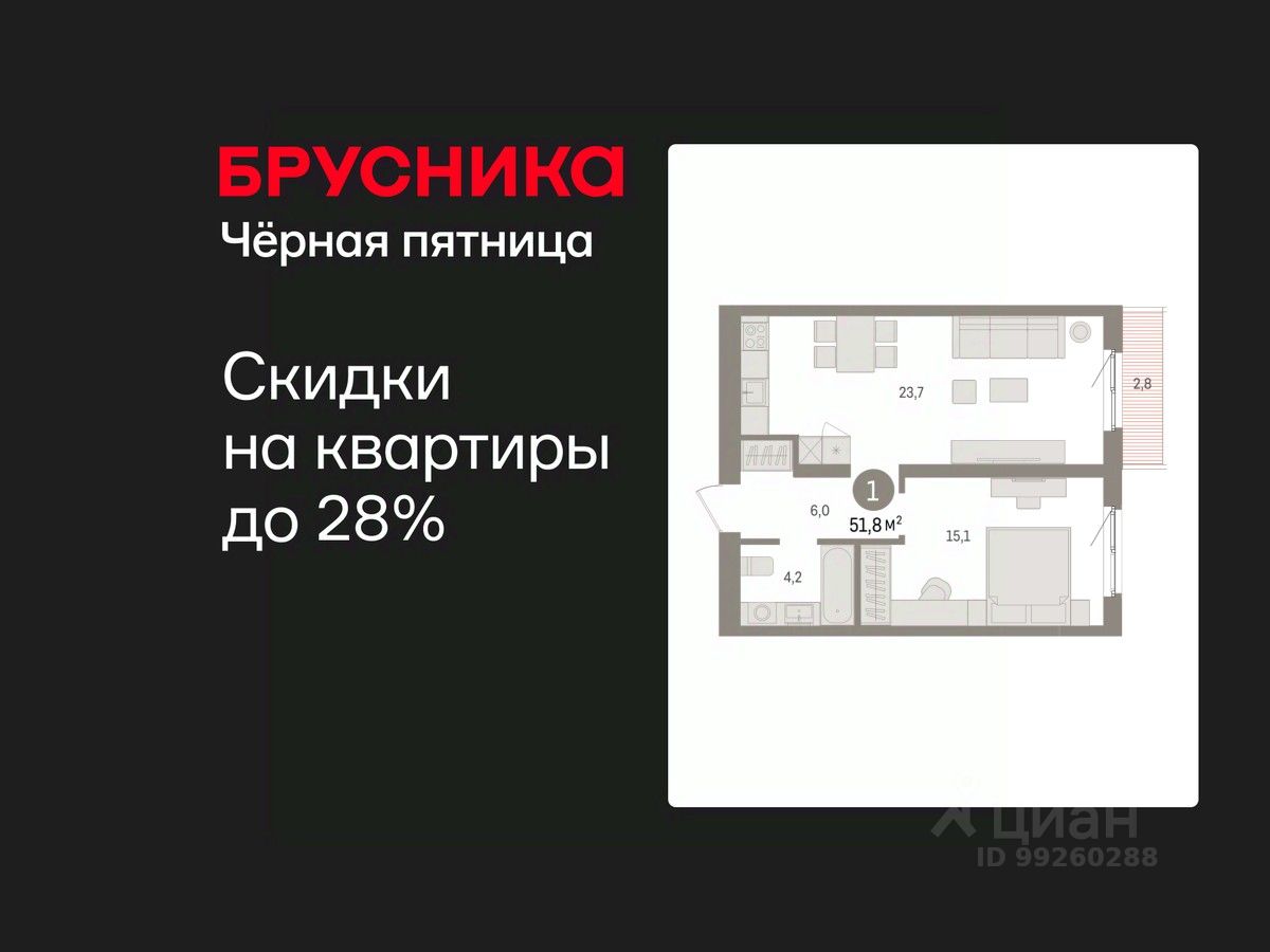 Квартира с кухней-гостиной и одной спальней в Южных кварталах. Особенности планировки: предчистовая отделка, балкон.