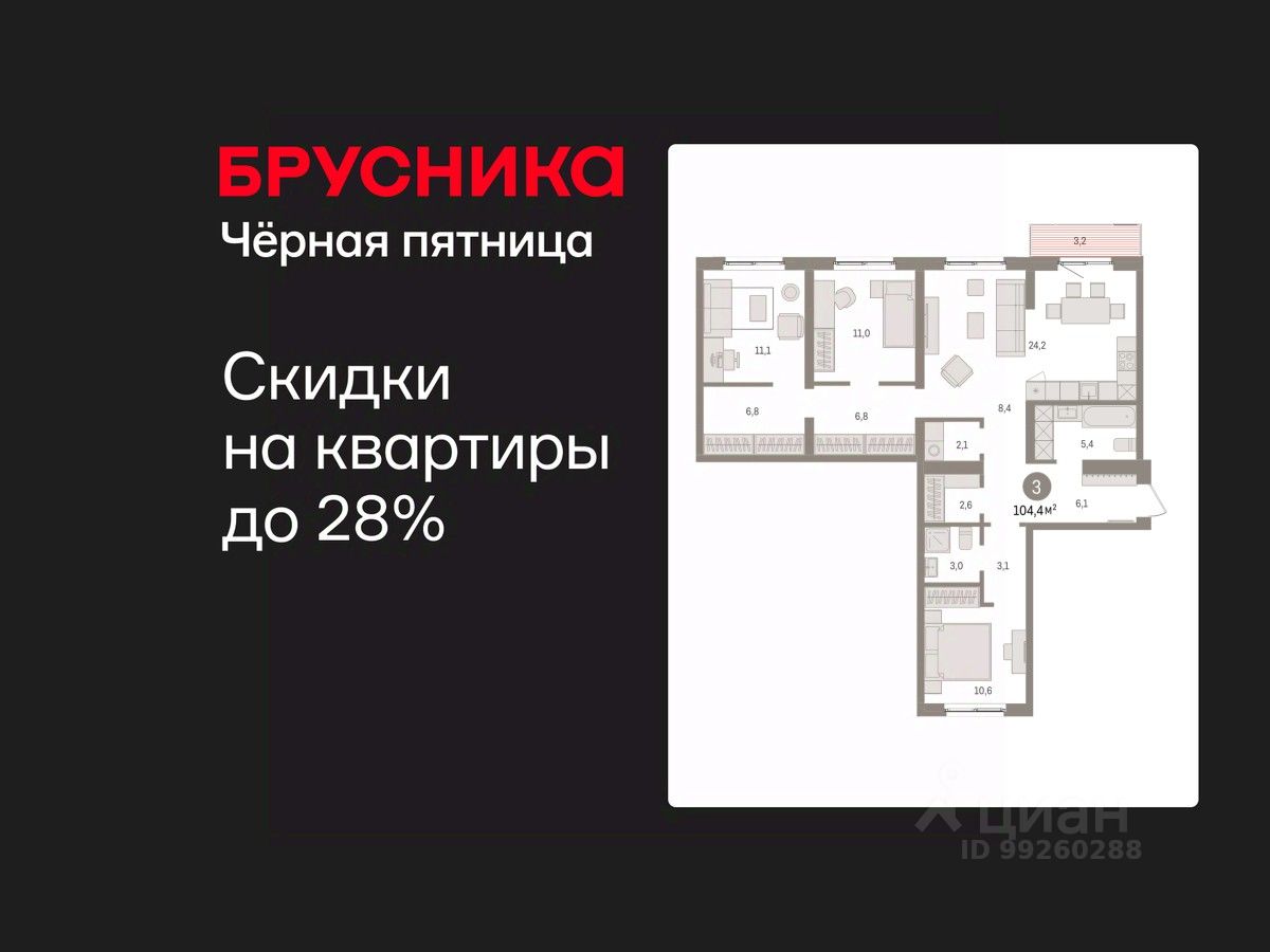 Квартира с кухней-гостиной и тремя спальнями в Южных кварталах. Особенности планировки: окна на две стороны, гардеробная, разнесённые спальни, предчистовая отделка, мастер-спальня, постирочная, балкон.