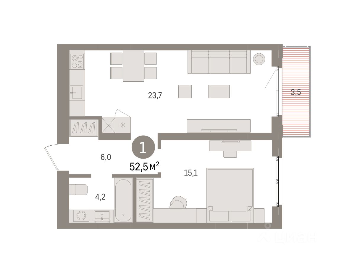 Квартира с кухней-гостиной и одной спальней в Южных кварталах. Особенности планировки: предчистовая отделка, балкон.