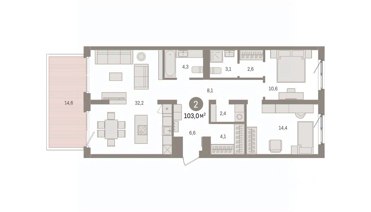 Квартира с кухней-гостиной и двумя спальнями в Южных кварталах. Особенности планировки: окна на две стороны, гардеробная, вид во двор, разнесённые спальни, предчистовая отделка, мастер-спальня, терраса, постирочная.