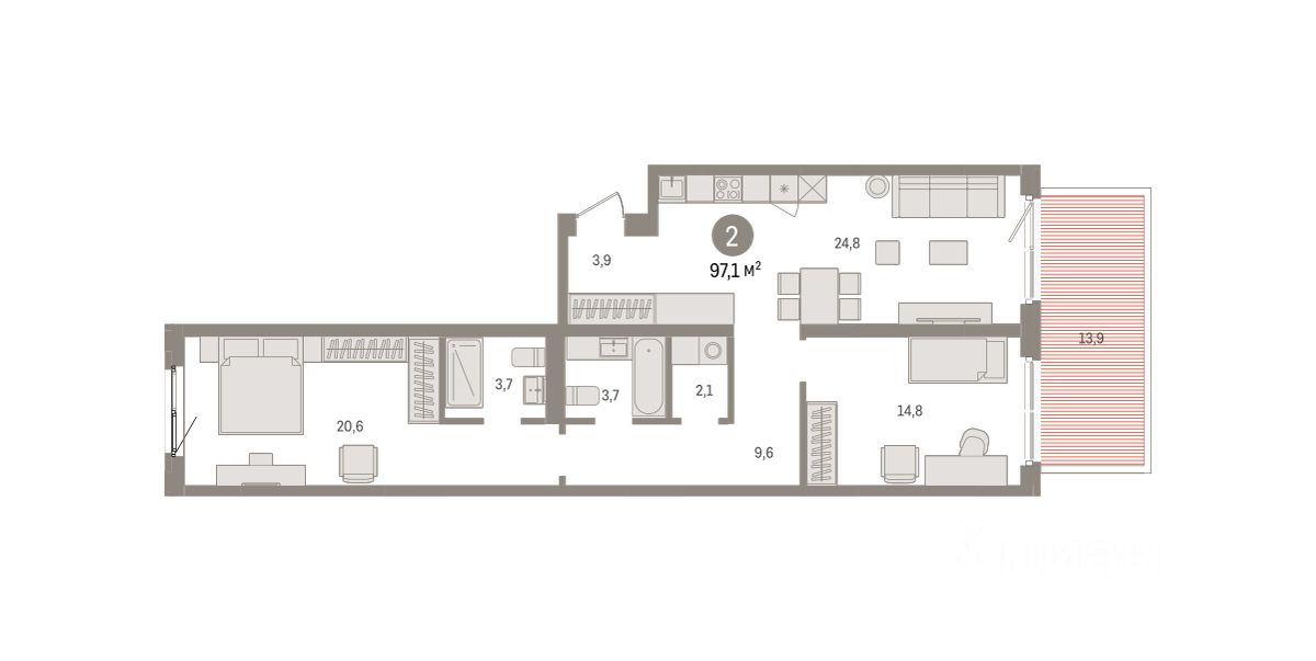 Квартира с кухней-гостиной и двумя спальнями в Южных кварталах. Особенности планировки: окна на две стороны, гардеробная, вид во двор, разнесённые спальни, предчистовая отделка, мастер-спальня, терраса, постирочная.