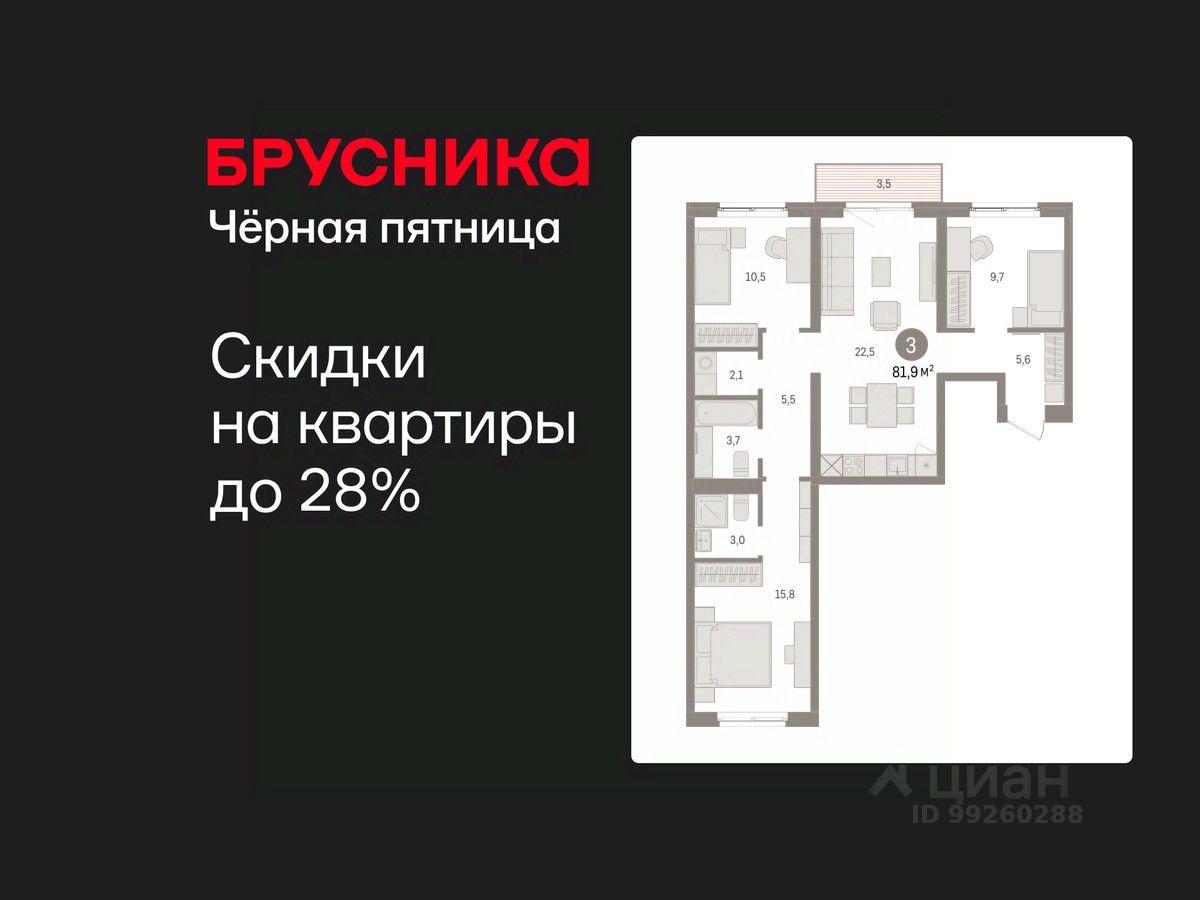 Квартира с кухней-гостиной и тремя спальнями в Южных кварталах. Особенности планировки: окна на две стороны, гардеробная, вид во двор, разнесённые спальни, предчистовая отделка, мастер-спальня, постирочная, балкон.