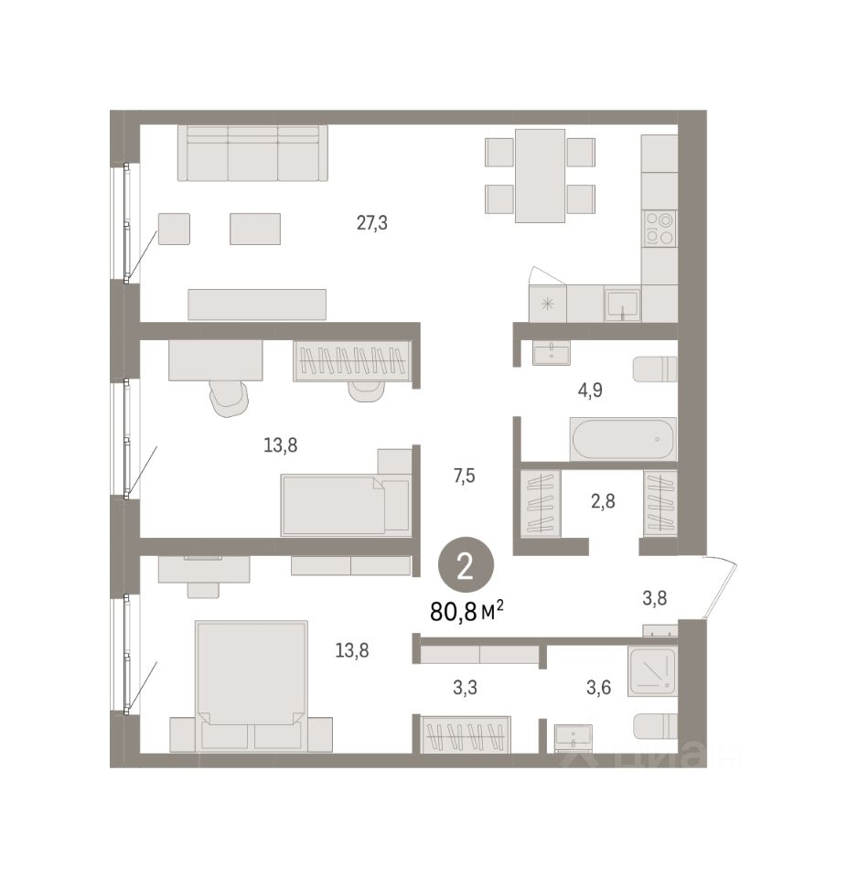 Квартира с кухней-гостиной и двумя спальнями в Южных кварталах. Особенности планировки: гардеробная, разнесённые спальни, предчистовая отделка, мастер-спальня.