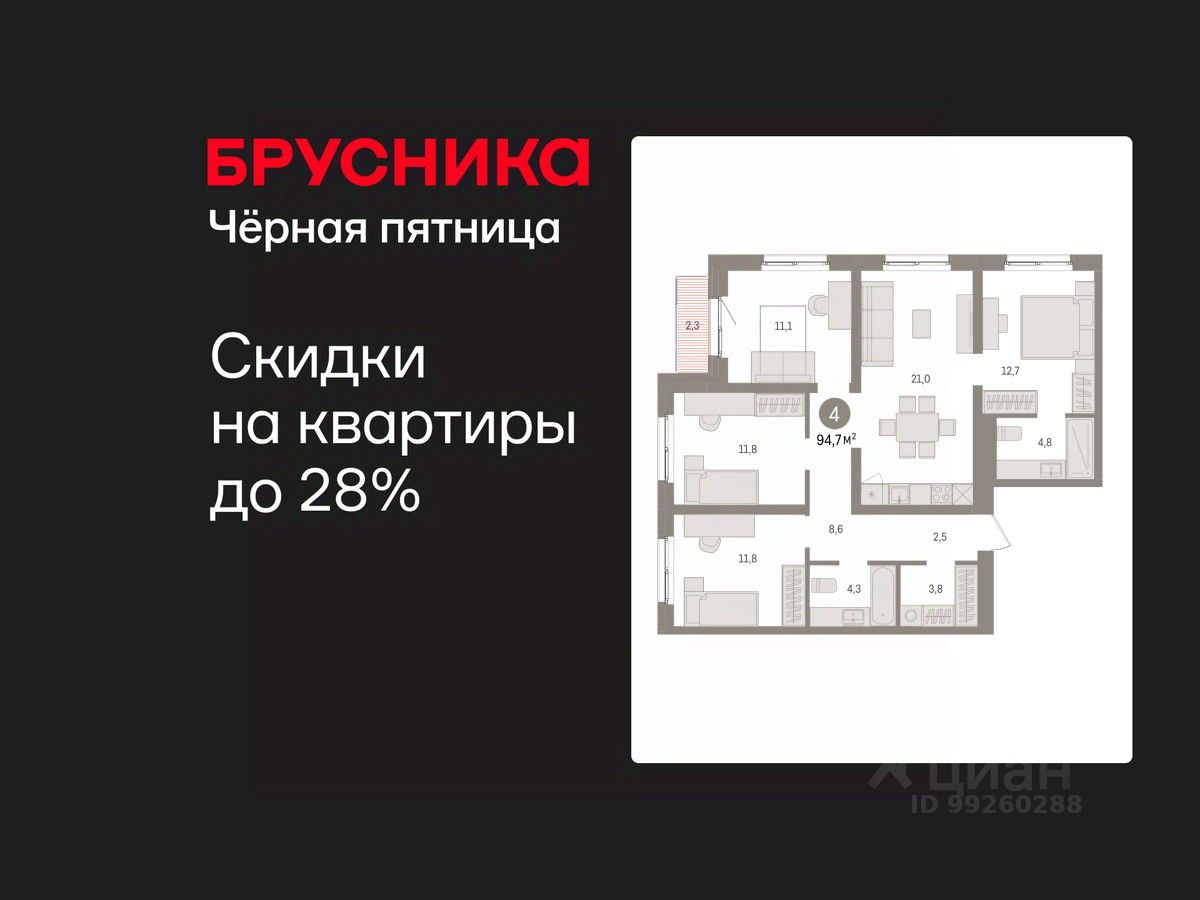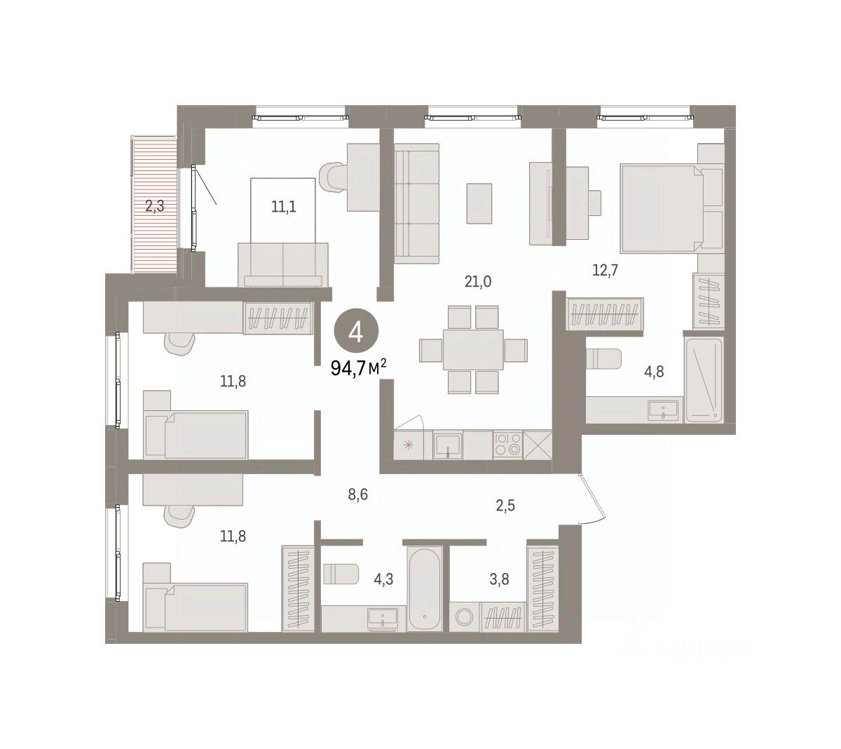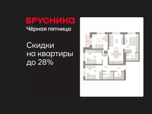 Квартира с кухней-гостиной и четырьмя спальнями в Южных кварталах. Особенности планировки: гардеробная, разнесённые спальни, предчистовая отделка, мастер-спальня, балкон.