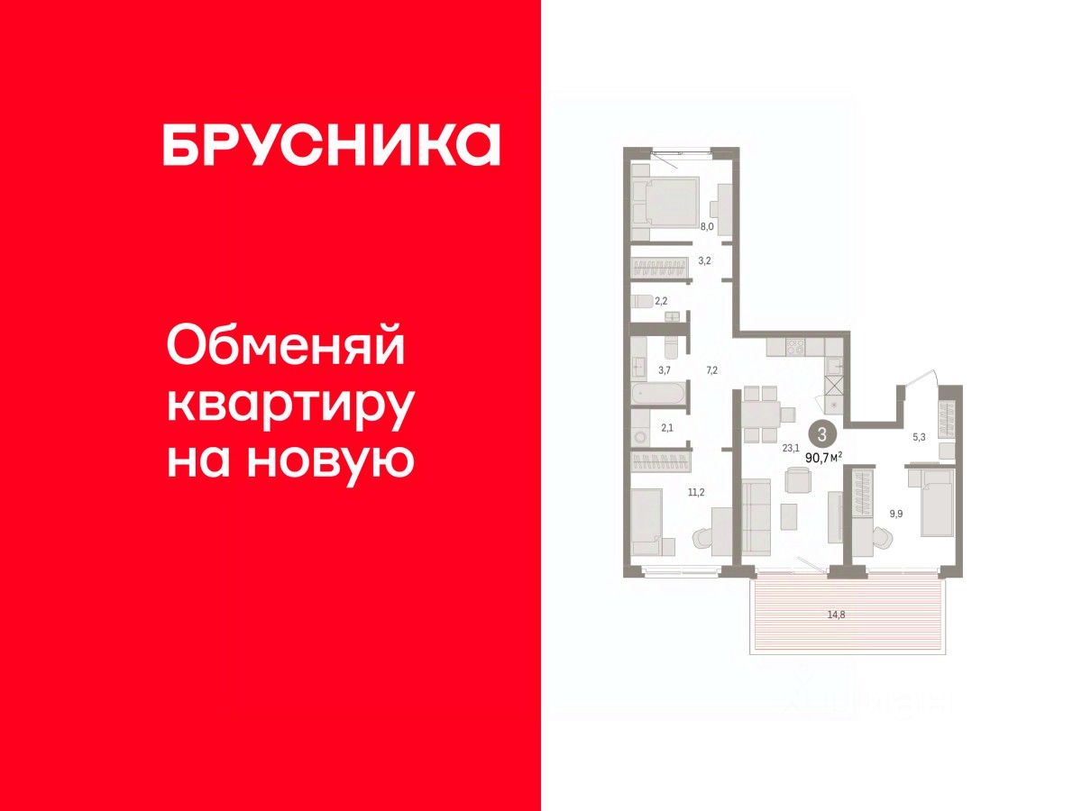 Квартира с кухней-гостиной и тремя спальнями в Южных кварталах. Особенности планировки: вид во двор, второй санузел, окна на две стороны, панорамное остекление, постирочная, потолки 3 м и выше, предчистовая отделка, разнесённые спальни, терраса.