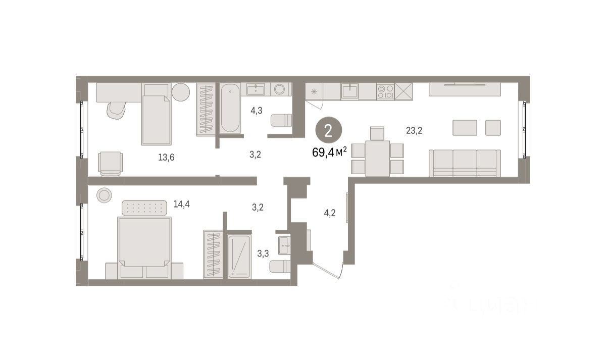 Квартира с кухней-гостиной и двумя спальнями в Южных кварталах. Особенности планировки: мастер-спальня, окна на две стороны, предчистовая отделка.