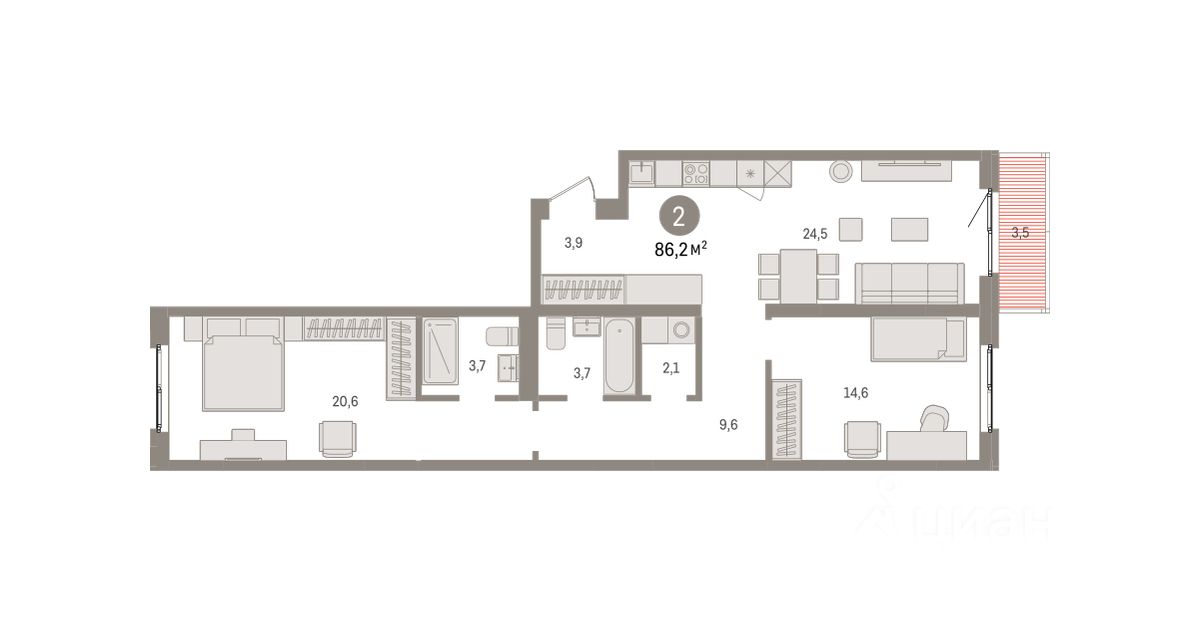 Квартира с кухней-гостиной и двумя спальнями в Южных кварталах. Особенности планировки: окна на две стороны, вид во двор, разнесённые спальни, предчистовая отделка, мастер-спальня, постирочная, балкон.