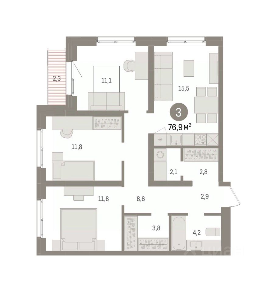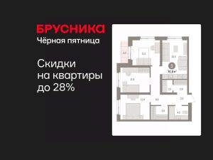 Квартира с кухней-гостиной и тремя спальнями в Южных кварталах. Особенности планировки: гардеробная, разнесённые спальни, предчистовая отделка, постирочная, балкон.