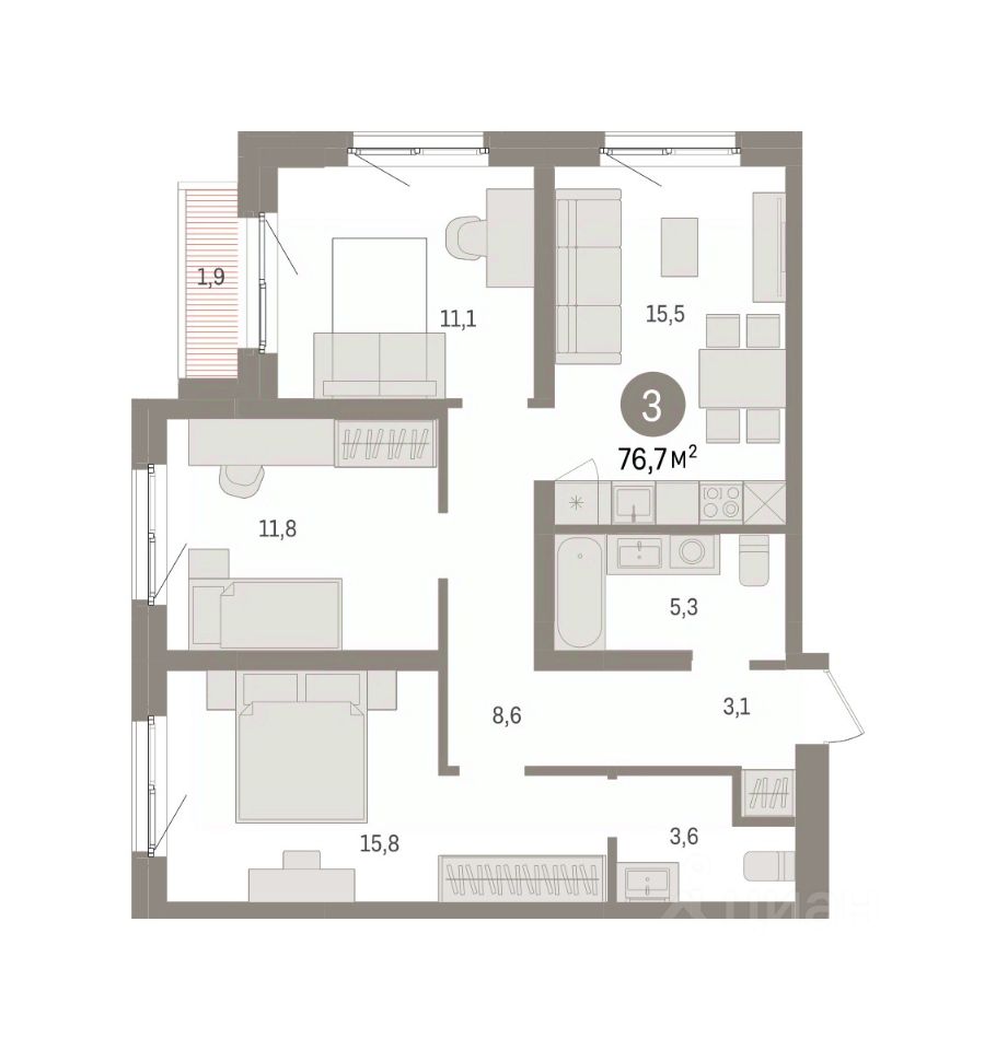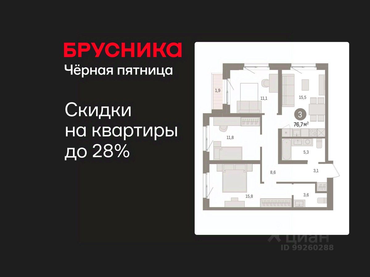 Квартира с кухней-гостиной и тремя спальнями в Южных кварталах. Особенности планировки: гардеробная, разнесённые спальни, предчистовая отделка, мастер-спальня, балкон.