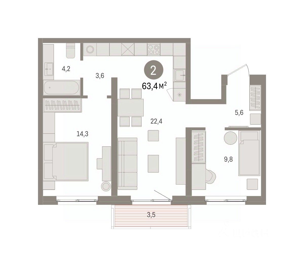 Квартира с кухней-гостиной и двумя спальнями в Южных кварталах. Особенности планировки: гардеробная, вид во двор, разнесённые спальни, предчистовая отделка, балкон.