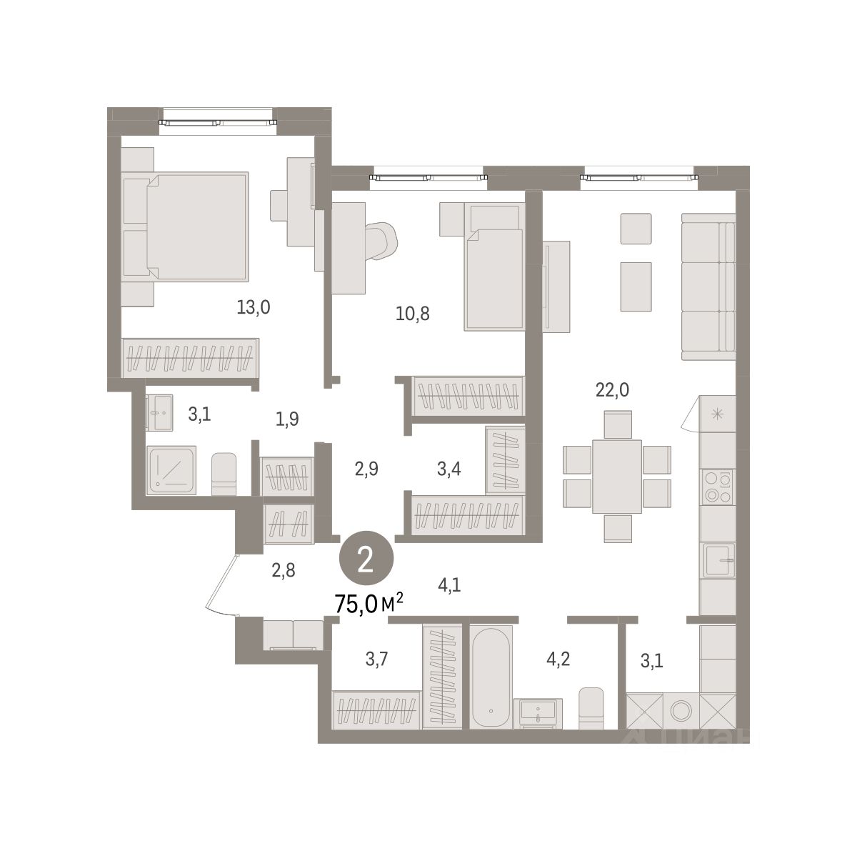 Квартира с кухней-гостиной и двумя спальнями в Южных кварталах. Особенности планировки: мастер-спальня, предчистовая отделка.