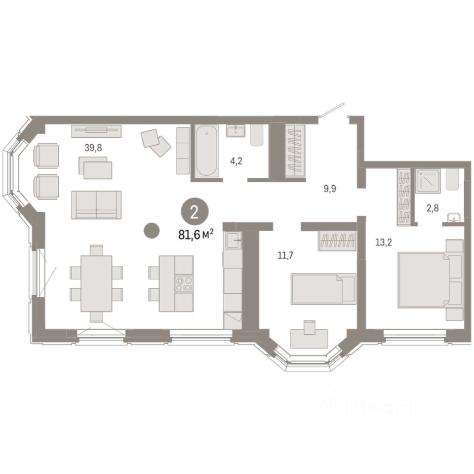 Квартира с кухней-гостиной и двумя спальнями в квартале "На Некрасова". Особенности планировки: предчистовая отделка, мастер-спальня.