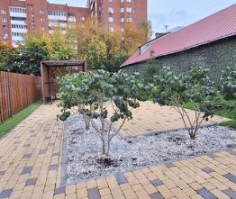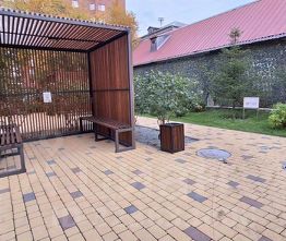 Уютный двор и детская площадка, есть парк с беседками, скамейки, газоны.
