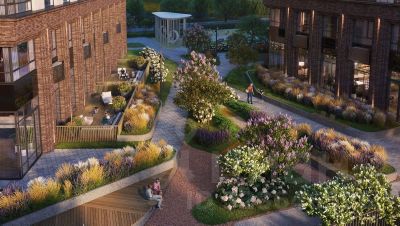 Квартал состоит из четырех 27-этажных домов. В домах — уютные студии, однокомнатные, двухкомнатные, семейные трехкомнатные квартиры. А для ценителей редких форматов квартиры с террасами. Парадный вестибюль с камином и кафе, двор с лаунж-зонами, фонтаном, сенсорным садом, детскими и спортивными площадками внутри.