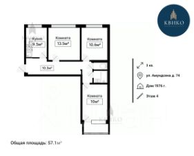 - 3 комнатная квартира с удобной планировкой: кухня - 9,5 м, изолированные комнаты - 13,5 м, 10,6 м и 10 м.
