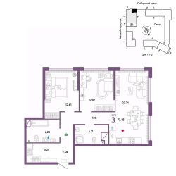 Продается 3комнатная квартира на 14 этаже от застройщика Страна Девелопмент. Площадь квартиры 73,18 кв. м. Стоимость указана без учета акций.