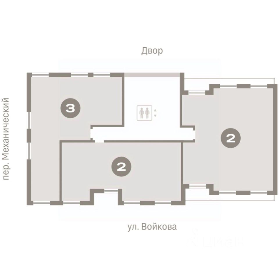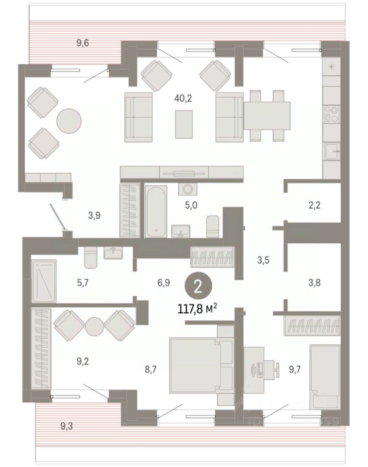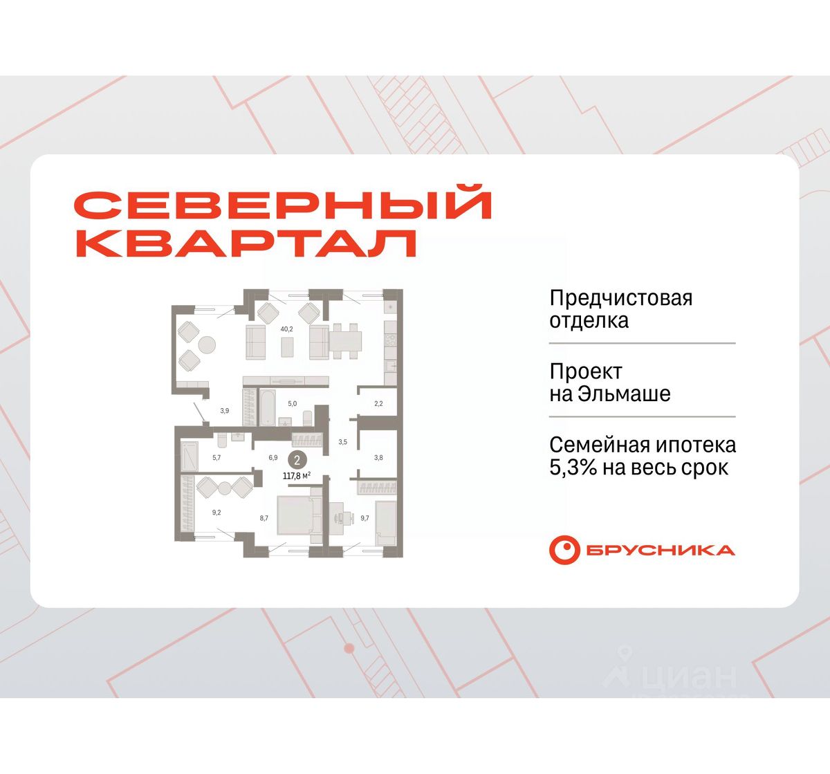 Квартира с кухней-гостиной и двумя спальнями в Северном квартале. Особенности планировки: окна на две стороны, гардеробная, вид во двор, предчистовая отделка, мастер-спальня, терраса на крыше.