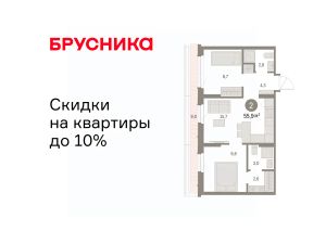 Квартира с кухней-гостиной и двумя спальнями в Бруснике в Академическом. Особенности планировки: предчистовая отделка, разнесённые спальни, терраса на крыше.