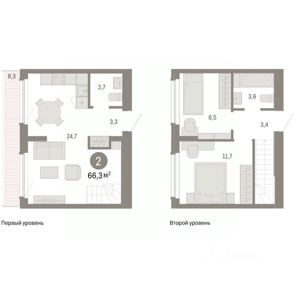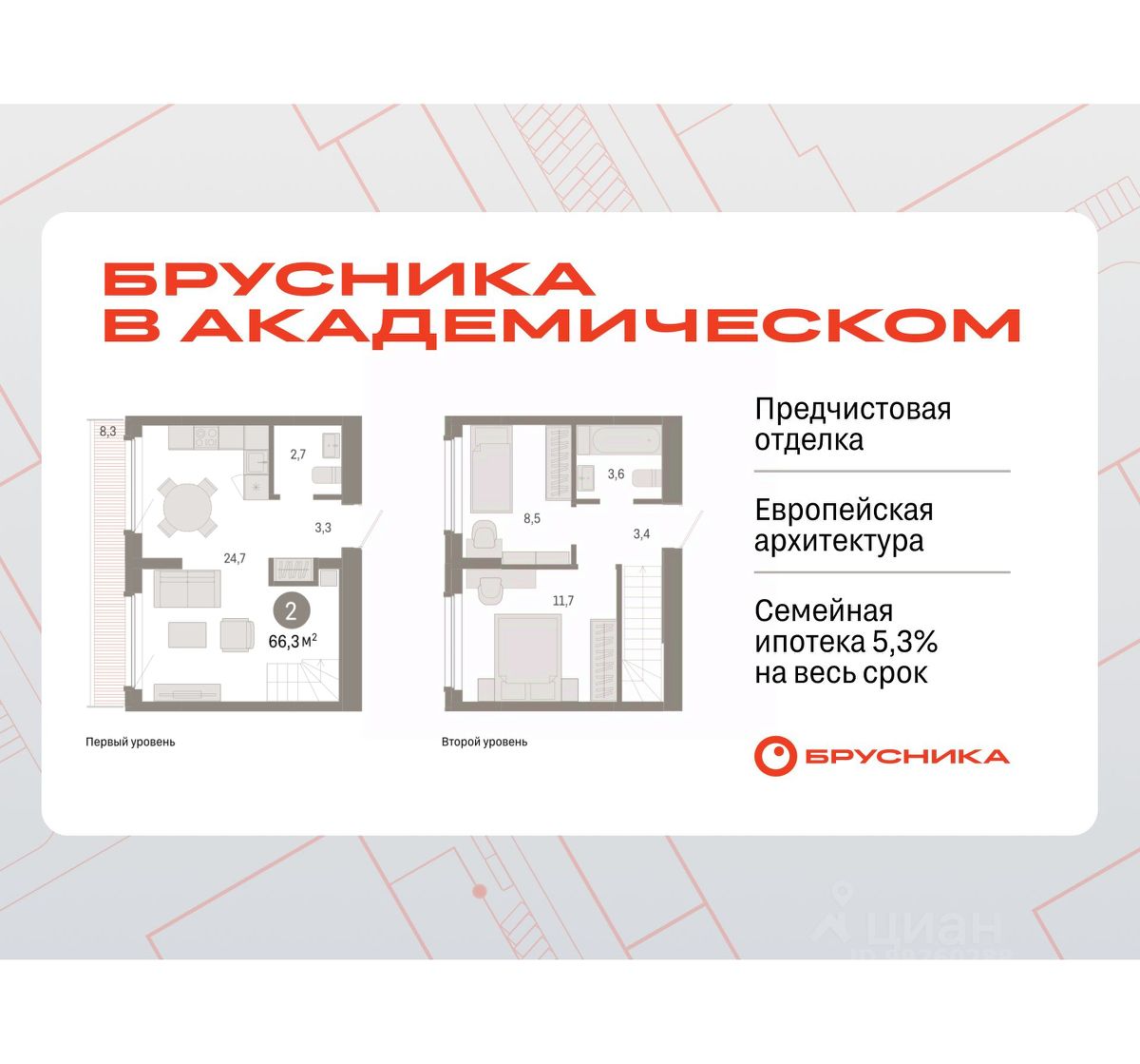 Двухуровневая квартира с кухней-гостиной и двумя спальнями в Бруснике в Академическом. Особенности планировки: второй санузел, двухуровневая, разнесённые спальни, предчистовая отделка, терраса на крыше.